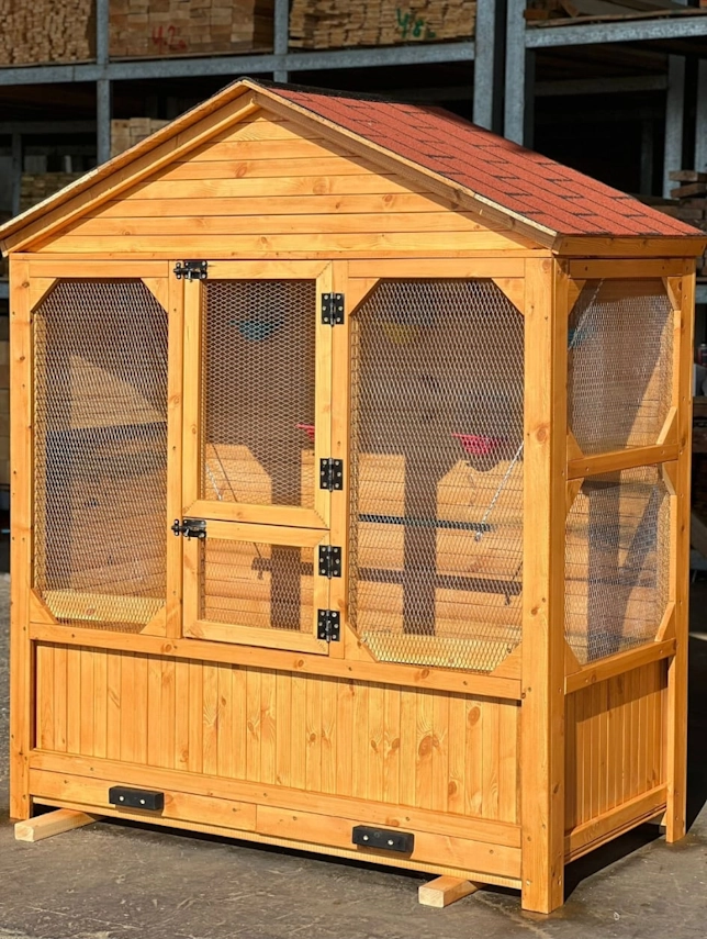 כלוב עמיד וחזק המשלב רשת מתכתית ותוספות עץ איכותי, תוכנן במיוחד לנוחות שימוש, ניקיון קל ועמידות לאורך זמן.